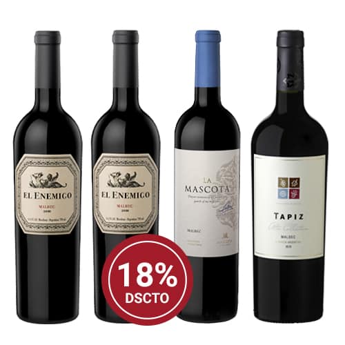 Colección compuesta por 2 botellas de El Enemigo Malbec, de bodegas Aleanna, D.O. Mendoza (Argentina) , 1 botella de La Mascota Malbec de Mascota Vineyards, D.O. Mendoza (Argentina) y 1 botella de Tapiz Alta Colletion Mabec de Bodega Tapiz, D.O. Valle del Uco – Mendoza (Argentina).