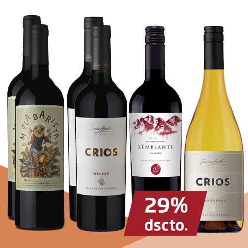 Colección compuesta por 2 botellas de Malabarista Malbec  de  Bodegas Malabarista,  D.O. Valle de Uco – Mendoza (Argentina), 2 botellas de CRIOS Malbec  de  Susana Balbo  Wines,  D.O. Valle de Uco – Mendoza (Argentina) , 1 botella de Semblante de bodegas Siegel Family Wines,  D.O.  Valle Central  (Chile)  y 1 botella de CRIOS  Chardonnay de Susana Balbo Wines, Gualtallary, Valle de Uco (Mendoza, Argentina).
