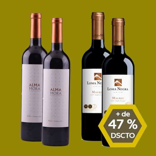 Colección compuesta por 2 botellas de Alma Mora Malbec de Finca Las Moras, San Juan – Mendoza (Argentina) y 2 botellas  de Loma Negra  Malbec  de Luis Felipe Edwards, D.O. Valle Colchagua  (Chile).