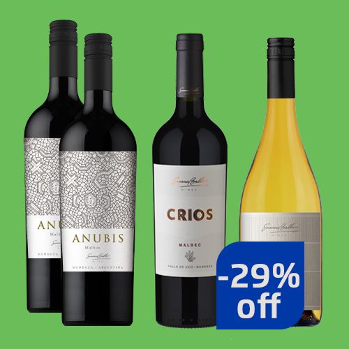 Colección compuesta por2 botellas de ANUBIS Malbec de Susana Balbo Wines, D.O. Agrelo – Luján de Cuyo (Argentina), 1 botella de CRIOS Malbec de Susana Balbo Wines, Gualtallary, Valle de Uco (Mendoza, Argentina) y 1 botella de CRIOS Chardonnay de Susana Balbo Wines, Gualtallary, Valle de Uco (Mendoza, Argentina).
