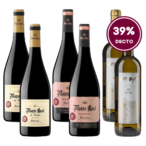 Colección compuesta por 2 botellas de Monte Real de Familia Tinto Reserva 2020, de Bodegas Riojanas, D.O. Ca. Rioja (España), 2 botellas de Monte Real de Familia Tinto Gran Reserva 2018, de Bodegas Riojanas, D.O. Ca. Rioja (España) y 2 botellas de Arroyo Verdejo Rueda 2024 de Bodegas Santiago Arroyo, D.O. Rueda (España).