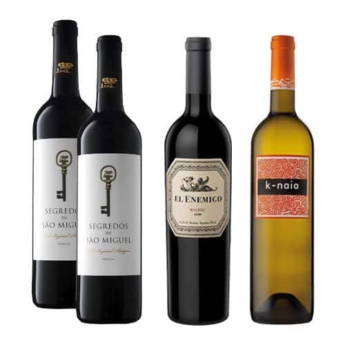 Colección compuesta por 2 botellas de Segredos de São Miguel de bodega Casa Selvas, D.O.C. Alentejo (Portugal), 1 botella El Enemigo Malbec de bodegas Aleanna, D.O. Mendoza (Argentina) y 1 botella de K-Naia de bodegas Naia, D.O. Rueda (España).