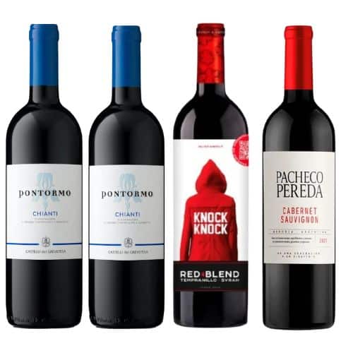 Colección compuesta por 2 botellas de Chianti Pontormo DOCG de Bodega Castelli del Grevepesa, DOCG Chianti, Toscana (Italia), 1 botella de Knock Knock Red Blendde bodegas Torre Oria , (España) y 1 botella de Pacheco Pereda Varietal Cabernet Sauvignon de Bodegas Pacheco Pereda Familia de Vinos, D.O. Mendoza (Argentina).