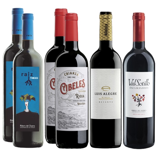 Colección compuesta 2 botellas de Raíz 9 meses de Bodegas Raíz de Guzmán, D.O. Ribera del Duero (España), 2 botellas de Cibeles Crianza 2018 de Bodegas Sonsierra, D.O. Ca. Rioja (España), 1 botella Luis Alegre Reserva 2016 de Bodegas Luis Alegre, D.O.Ca. Rioja (España) y 1 botella de Valsotillo Finca Buenavista 2018 de Bodegas Ismael Arroyo Valsotillo, D.O. Ribera del Duero (España).