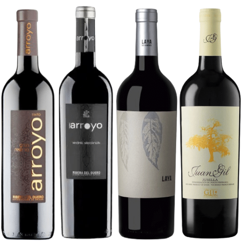 Colección compuesta por 1 botella de Arroyo Gran Reserva2015 de Bodegas Santiago Arroyo, D.O. Ribera del Duero (España), 1 botella de Arroyo Vendimia Seleccionada 2015 de Bodegas Santiago Arroyo, D.O. Ribera del Duero (España), 1 botella de Laya 2023, de bodegas Atalaya,D.O. Almansa (España) y 1 botella de Juan Gil Etiqueta Amarilla 2023, de bodegas Juan Gil, D.O.P. Jumilla (España).