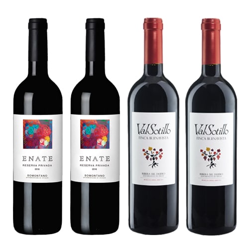 Colección compuesta por 2 botellas de Enate Reserva Privada 2016 de Bodegas Enate, D.O. Somontano (España) y 2 botellas de Valsotillo Finca Buenavista 2018 de Bodegas Ismael Arroyo Valsotillo, D.O. Ribera del Duero (España).
