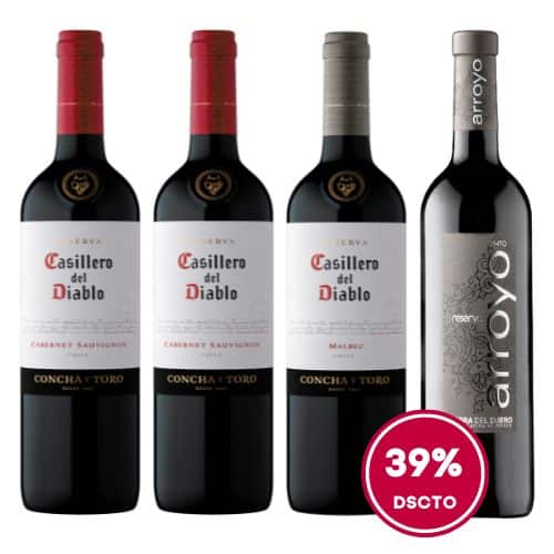 Colección compuesta por 2 botellas de Casillero del Diablo Cabernet Sauvignon de Bodegas Concha y Toro, D.O. Valle Central (Chile), 1 botella de Casillero del Diablo Cabernet Sauvignon de Bodegas Concha y Toro, D.O. Valle Central (Chile) y 1 botella de Arroyo Reserva 2017 de Bodegas Santiago Arroyo, D.O. Ribera del Duero (España).