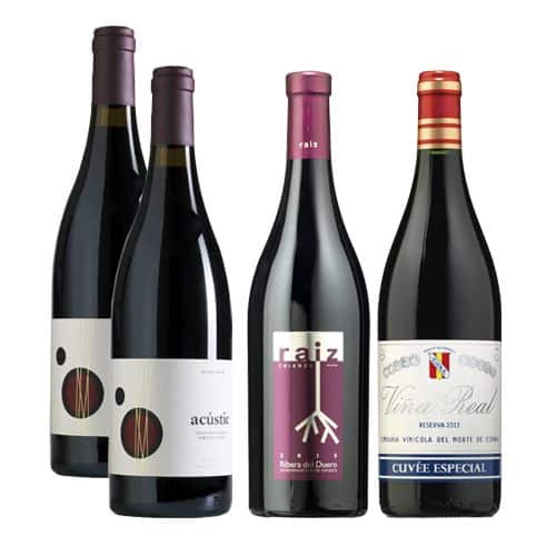 Selección compuesta por 2 botellas de Acustic 2016 de Acustic Celler, D.O. Monsant (España), 1 botella de Raíz de Guzmán de Bodegas Raíz, D.O. Ribera del Duero (España), 1 botella de Viña Real Cuvée Especial Tinto Reserva 2013, de Bodegas Viña Real, D.O.Ca. Rioja (España)