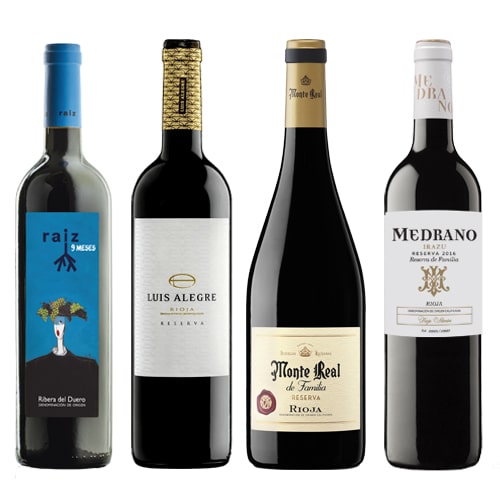 Colección compuesta por 1 botella de Raíz 9 meses de Bodegas Raíz de Guzmán, D.O. Ribera del Duero (España), 1 botella Luis Alegre Reserva 2016 de Bodegas Luis Alegre,D.O.Ca. Rioja (España),  1 botella de Monte Real de Familia Tinto Reserva 2018, de Bodegas Riojanas, D.O. Ca. Rioja (España) y 1 botella de  Medrano Reserva de Famila 2016 de Bodegas Medrano Irazu, D.O. Ca. Rioja (España).