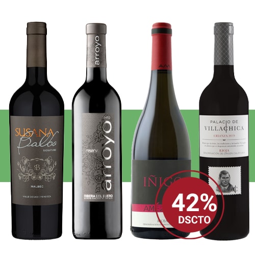 Colección compuesta por 1 botella de Susana Balbo Signature Malbec de Susana Balbo Wines, Gualtallary, Valle de Uco (Mendoza, Argentina), 1 botella de Arroyo Reserva 2017 de Bodegas Santiago Arroyo, D.O. Ribera del Duero (España), 1 botella de Íñigo Amézola 2019, de Bodegas Amézola de la Mora, D.O. Ca. Rioja (España) y 1 botella de Palacio de Villachica Crianza 2019, de Bodegas Palacio de Villachica, D.O. Ca. Rioja (España).