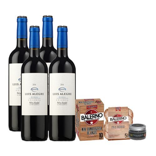 Colección compuesta por 4 botellas de Luis Alegre Crianza 2014 – Edición Limitada de Bodegas Luis Alegre, D.O.Ca. Rioja (España) 1 paquete de Mini Hamburguesas Angus x10, 1/2 kg de Chorizo Finas Hierbas y Sal de Maras ahumada Mina Muru 120 g    – Productos 100% artesanales de Balerno.