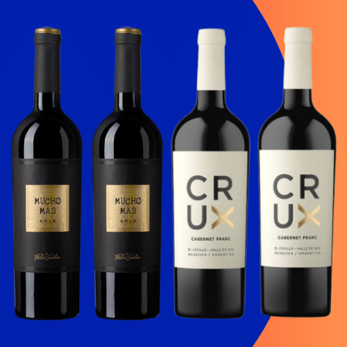 Colección compuesta por 2 botellas 2 botellas de Mucho Más Gold, de bodegas Félix Solis, D.O. España  y 2 botellas de Crux Malbec de Agostino Wines, D.O. Valle de Uco – Mendoza (Argentina).
