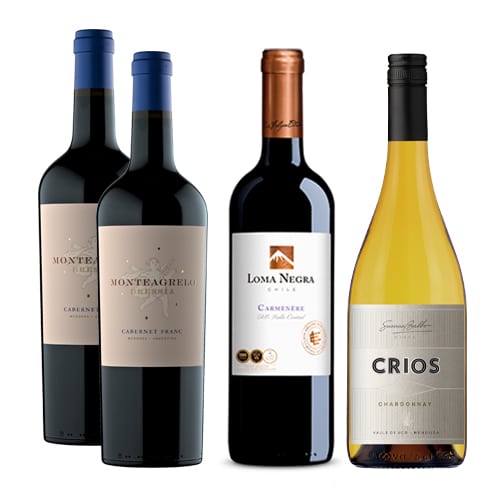 Colección compuesta 2 botellas de Monteagrelo Bressia Cabernet Franc   de Bresia Casa de Vinos, Valle de Uco (Mendoza, Argentina), 1 botella de Loma Negra Carmenère de Luis Felipe Edwards,  D.O. Valle de Colchagua  (Chile), 1 botella de CRIOS  Chardonnay de Susana Balbo Wines, Valle de Uco (Mendoza, Argentina).