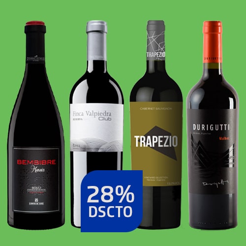 Colección compuesta por 1 botella de Bembibre 2015 de Viñedos y Bodegas Dominio de Tares, D.O. Bierzo (España). y 1 botella de Tilenus Pagos de Posada 2013, de Bodegas Estefanía, D.O. Bierzo (España), 1 botella de Finca Valpiedra Reserva Club 2014, D.O.Ca. Rioja (España) y 1 botella de Vineyard Selection Trapezio Cabernet Sauvignon de bodegas Trapezio – Finca La Promesa, D.O. Luján de Cuyo – Mendoza (Argentina) y 1 botella de Durigutti Clásico Malbec de bodegas Durigutti Family Winemakers, D.O. Luján de Cuyo – Mendoza (Argentina).