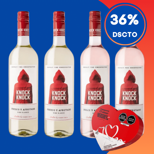 Colección compuesta por 2 botellas de Knock Knock Blanco Blend de bodegas Torre Oria , España, 2 botellas de Knock Knock Rosé Bodal de bodegas Torre Oria , España y 1 caja Chocolate HERSHEY’S Kisses Corazón Rojo