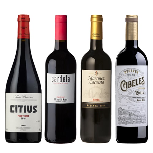 Colección compuesta por 1 botella de Citius 2016 de Bodegas Alta Pavina, Vino de la Tierra de Castilla y León (España), 1 botella de Cardela Crianza 2017 de Bodegas Bohórquez, D.O. Ribera del Duero (España), 1 botella de Martínez Lacuesta Reserva 2014 de Bodegas Martínez Lacuesta, D.O. Rioja (España) y 1 botella de Cibeles Reserva 2015 de Bodegas Sonsierra, D.O. Ca. Rioja (España).