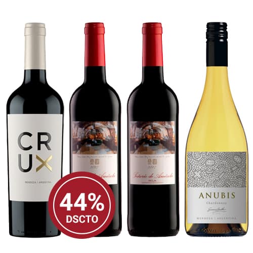 Colección compuesta por 1 botella de Crux Malbec de Agostino Wines, D.O. Valle de Uco-Mendoza (Argentina),2 botellas de Señorío de Amézola 2017, de Bodegas Amézola de la Mora, D.O. Ca. Rioja (España) y 1 botella de Anubis Chardonnay de Susana Balbo Wines, D.O. Agrelo – Luján de Cuyo (Argentina).