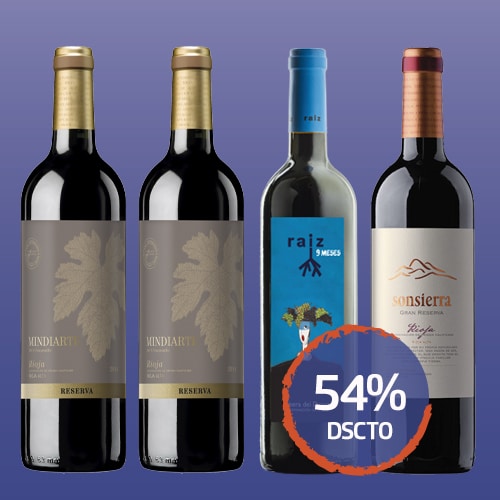 Colección compuesta por 2 botellas de Mindiarte Reserva 2016 de Bodegas Sonsierra, D.O. Ca. Rioja (España), 1 botella de Raíz 9 meses de Bodegas Raíz de Guzmán, D.O. Ribera del Duero (España) y 1 botella de Sonsierra Gran Reserva 2016 de Bodegas Sonsierra, D.O. Ca. Rioja (España).