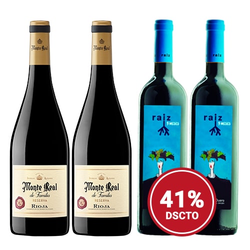 Colección compuesta por 2 botellas de Monte Real de Familia Tinto Reserva 2018, de Bodegas Riojanas, D.O. Ca. Rioja (España) y 2 botellas de Raíz 9 meses de Bodegas Raíz de Guzmán, D.O. Ribera del Duero (España), 1 botella Luis Alegre Reserva 2016 de Bodegas Luis Alegre,D.O.Ca. Rioja (España),