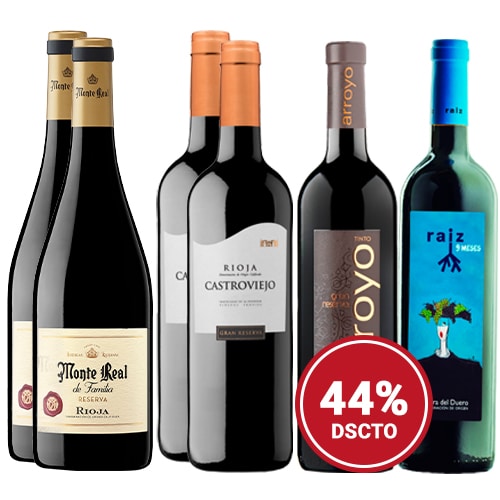 Colección compuesta por 2 botellas de Monte Real de Familia Tinto Reserva 2018, de Bodegas Riojanas, D.O. Ca. Rioja (España), 2 botellas de Castroviejo Gran Reserva 2016 de Bodegas Pastor Díaz, D.O. Ca. Rioja (España), 1  botella de Tinto Arroyo Gran Reserva 2015 de Bodegas Santiago Arroyo, D.O. Ribera del Duero (España)  y 1 botella de Raíz 9 meses de Bodegas Raíz de Guzmán, D.O. Ribera del Duero (España).