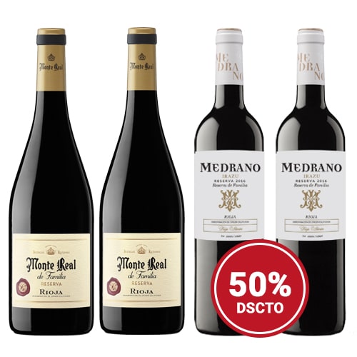 Colección compuesta por 2 botellas de Monte Real de Familia Tinto Reserva 2018, de Bodegas Riojanas, D.O. Ca. Rioja (España) y 2 botellas de Medrano Reserva de Famila 2016 de Bodegas Medrano Irazu, D.O. Ca. Rioja (España).
