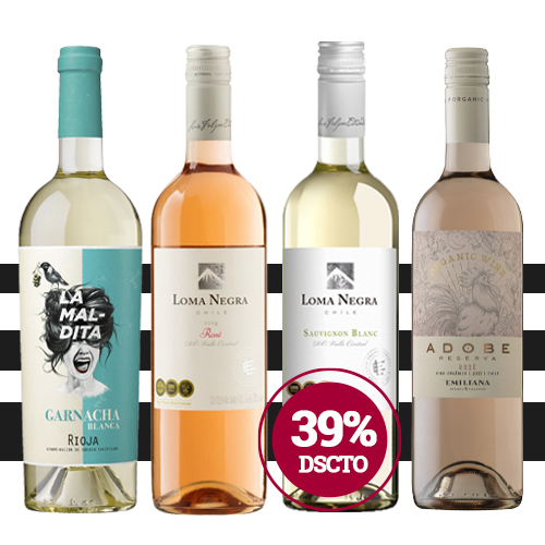 Colección compuesta por 1 botella de La Maldita Garnacha Blanco de Viñedos La Maldita, D.O.Ca. Rioja (España), 1 botella de Loma Negra Rosé de Bodegas Luis Felipe Edwards, D.O. Valle Central (Chile), 1 botella de Loma Negra Sauvignon Blanc de Bodegas Luis Felipe Edwards, D.O. Valle Central (Chile) y 1 botella de Adobe Reserva Rosé de Emiliana Organic Vineyards, D.O. Valle Central  (Chile).