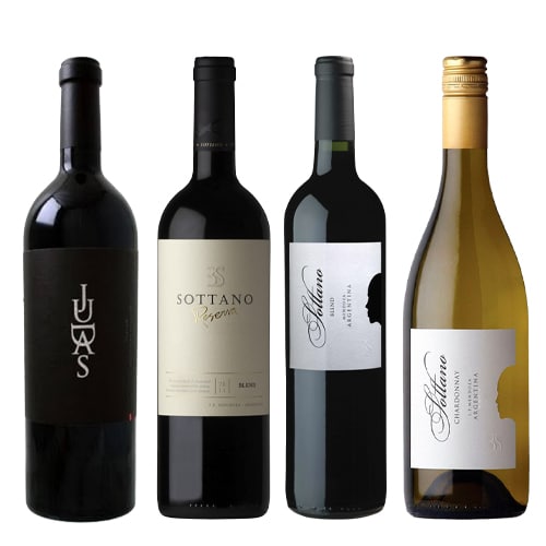 Colección compuesta por 1 botella de Judas Malbec , 1 botella de Sottano Reserva Malbec, 1 botella de Sottano Blend y 1 botella de Sottano Chardonnay de bodegas Sottano, Luján de Cuyo (Argentina).