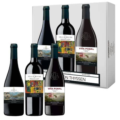 1 botella de CM Prestigio 2019 de Bodegas CM de Matarromera, D.O.Ca. Rioja, 1 botella de Finca Villacreces 2019 de Bodegas Finca Villacreces D.O. Ribera del Duero y 1 botella de Viña Pomal Gran Reserva 2016 de Bodegas Bilbaínas, D.O.Ca. Rioja. Cada una de sus etiquetas reproduce una obra maestra universal perteneciente a la colección del Museo Nacional Thyssen-Bornemisza de Madrid.