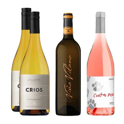 Colección compuesta por 2 botellas de CRIOS Chardonnay de Susana Balbo Wines, Gualtallary, Valle de Uco (Mendoza, Argentina), 1 botella de Viña Vilano Verdejo de Bodegas Viña Vilano, D.O. Rueda (España) y 1 botella de Cuatro Pasos Rosado de bodegas Cuatro Pasos, D.O. Bierzo (España).