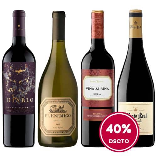 Colección compuesta por 1 botella de Diablo Purple Malbec de Bodegas Concha y Toro, D.O. Valle del Maule (Chile), 1 botella de El Enemigo Semillón, de bodegas Aleanna,D.O. Mendoza(Argentina), 1 botellas de Viña Albina Reserva Vendimia Seleccionada 2019 de Bodegas Riojanas, D.O.Ca. Rioja (España) y 1 botella de Monte Real de Familia Tinto Reserva 2019, de Bodegas Riojanas, D.O. Ca. Rioja (España).
