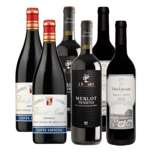 Selección compuesta por 2 botellas de Viña Real Cuvée Tinto Reserva Especial 2013 de Bodega Viña Real, D.O.Ca. Rioja (España), 2 botellas i Basalti Merlot 2017 de Bodegas Cantina di Gambellara, Merlot Veneto I.G.T. (Italia) y 2 botellas de Viña Collada de Vinos de los Herederos del Marqués de Riscal, D.O.Ca. Rioja (España)