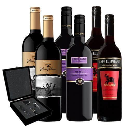 Lote compuesto por 2 botellas de Viña Vilano Roble 2010 de bodegas Viña Vilano, D.O. Ribera del Duero (España), 2 botellas de Principato Merlot de Bodega Principato Vigneti, Venezie IGT, Valle de Vallagaria (Italia), 2 botellas de Cape Elephant  de Cape Diamond Wines, Valle LutzVille (Sudáfrica) y 1 Set de accesorios para el vino.